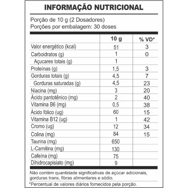 - Cafeína: "A cafeína é conhecida por suas propriedades estimulantes, proporcionando mais energia, foco e concentração durante os treinos e atividades diárias."